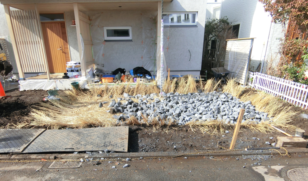 雨水を地中に浸透させるには、通常は泥をろ過するために透水シートを敷く方法が一般的ですが、N様邸ではより健やかな土中環境を目指し、砕石と藁を層状に重ねる手法を採用。そこに植物が深く根ざし、力強く土中の水を吸いあげる素地をつくることで、水の動きをつくって滞水を起こしにくい“健全な土壌”を育むための工夫が施されています。