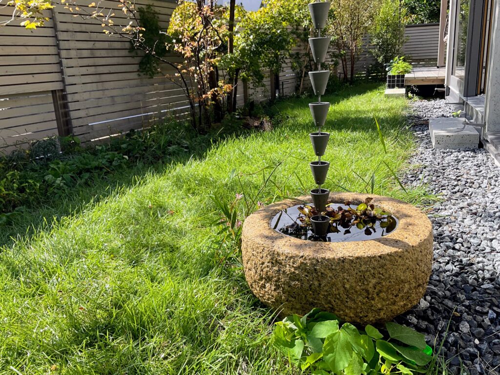 ▲くさび型の雨樋の先に置かれた鉢には、雨水を利用したメダカの住まいが。自然の循環が、暮らしのなかにそっと息づいている。