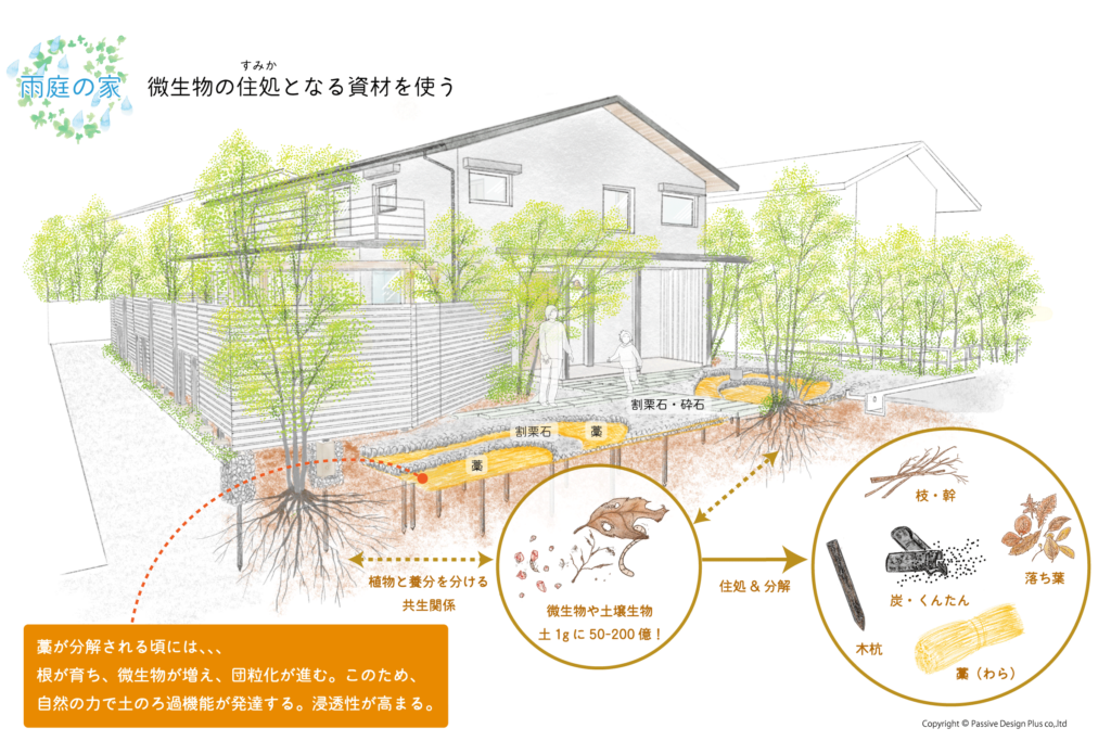 ▲パッシブデザインプラスでは、落ち葉や木の枝、藁、炭・くん炭たんなどを活用した造園工事を行っている。