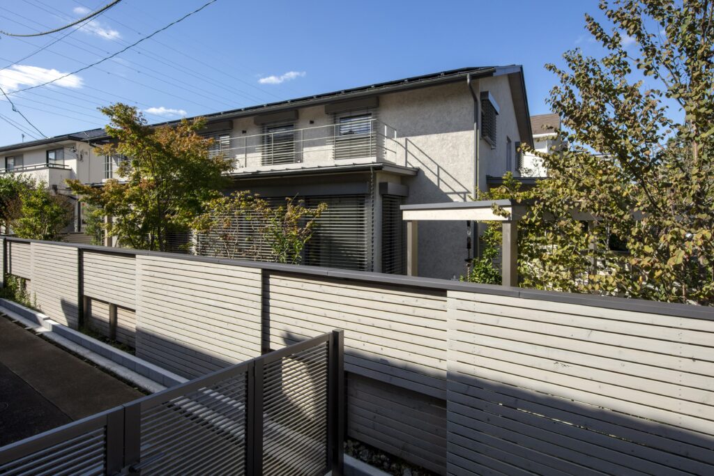 ▲外壁、開口部、外付けブラインドがグレーカラーでまとめられている。
