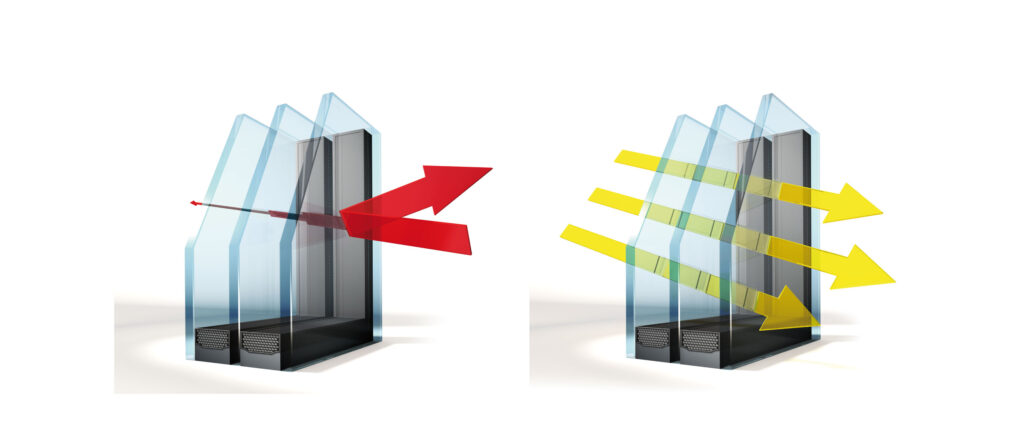 ▲ユニルクスは、ガラス4㎜×3枚+空気層18㎜×2層を組み合わせた総厚48㎜のトリプルガラス構造。