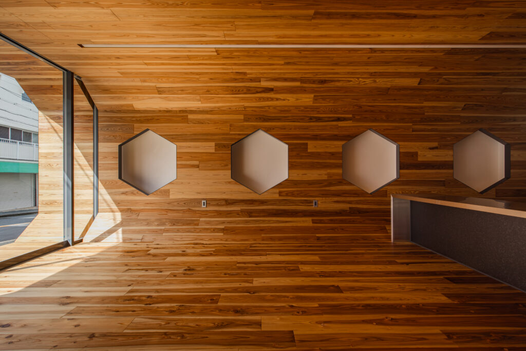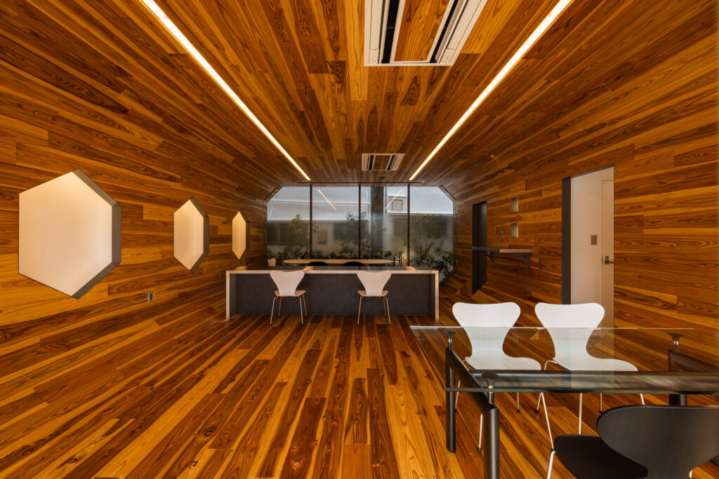 屋久島地杉の採用理由について表様に伺うと「吉野の杉や桧とも迷いましたが、外から内まで連続性のある意匠にしたかったこと、そして土足での利用も想定していたため、油分が多く耐久性に優れる屋久島地杉を選びました」と、嬉しいお言葉をいただきました。